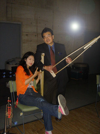 本番直前、緞帳中で安らぎの一瞬!